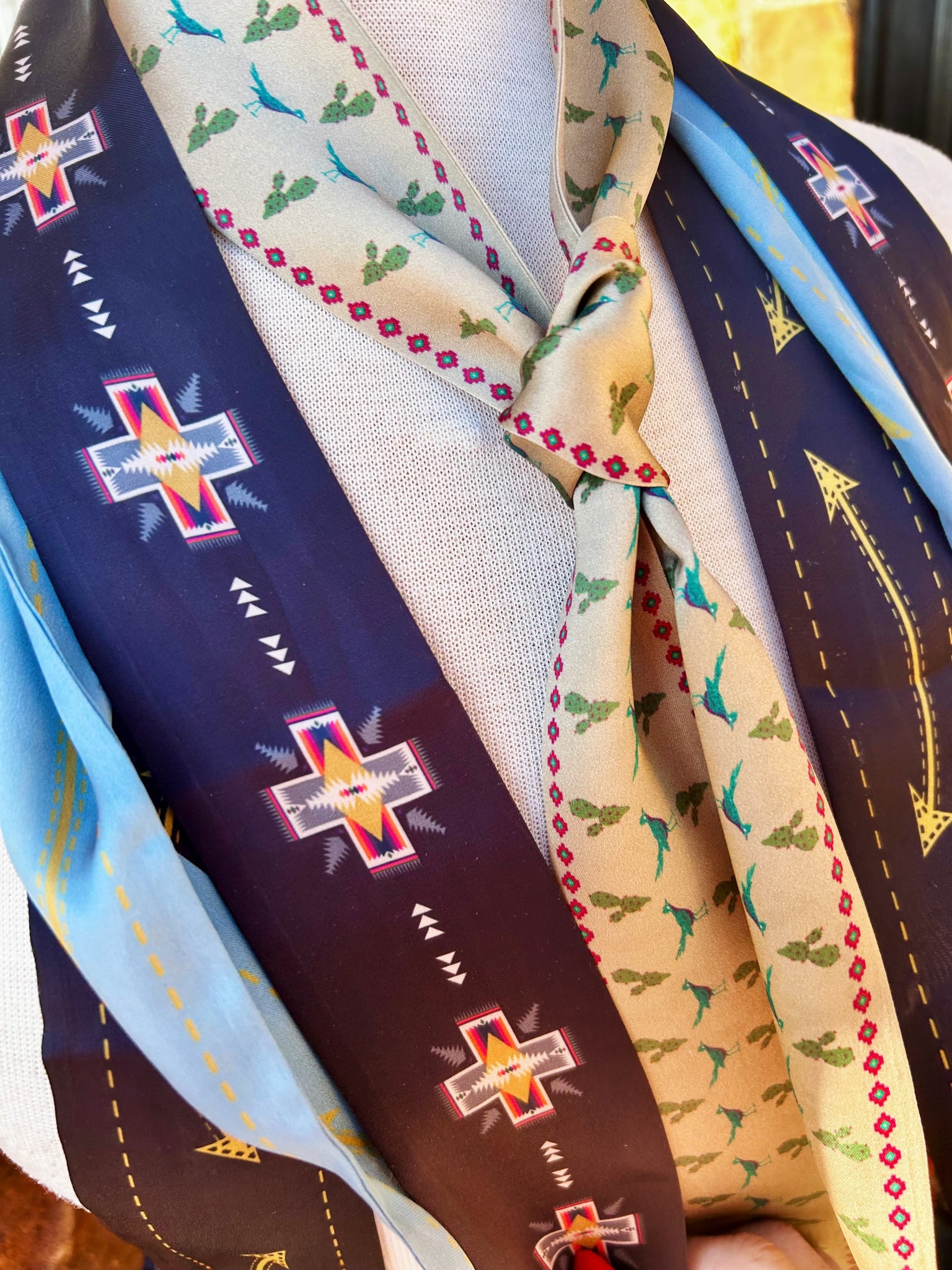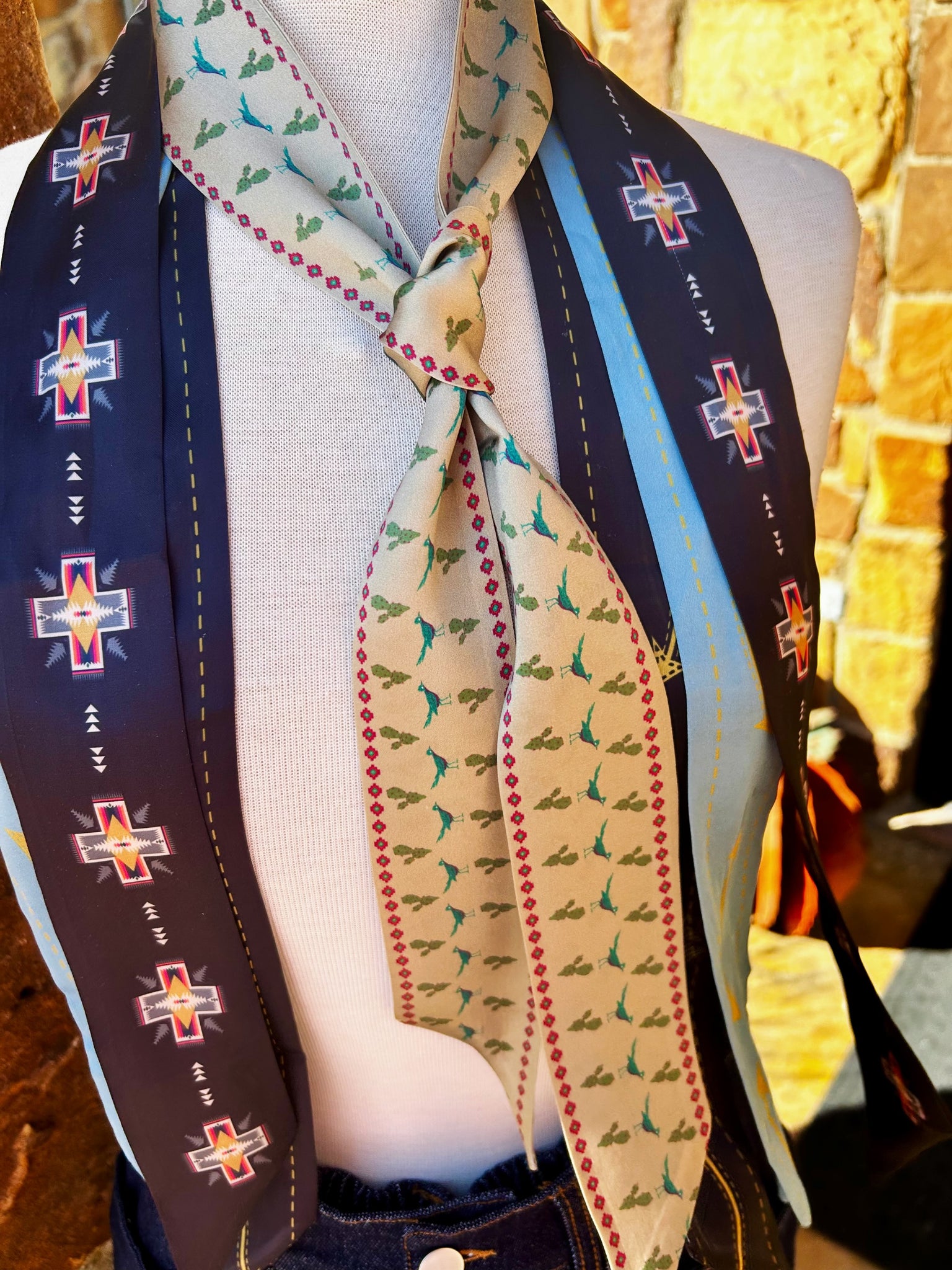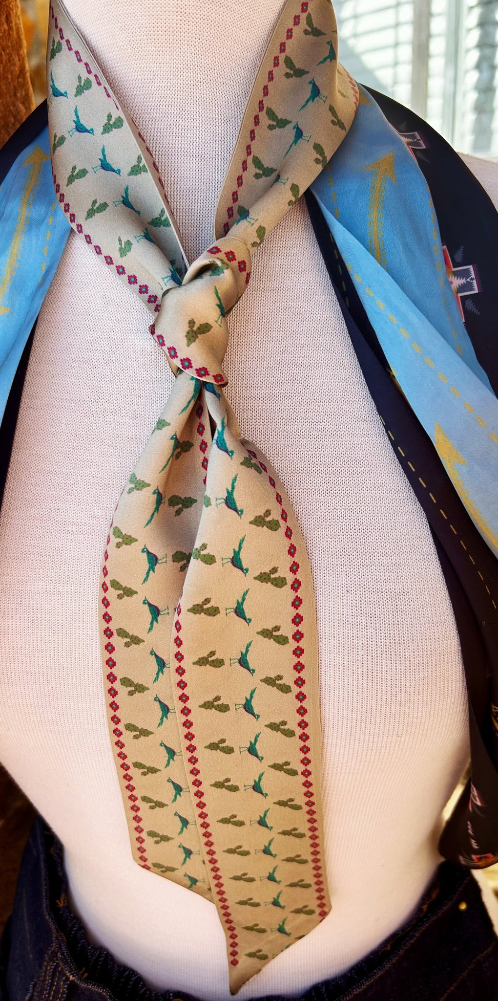 Silk Twilly with roadrunners, cactus with Aztec border.