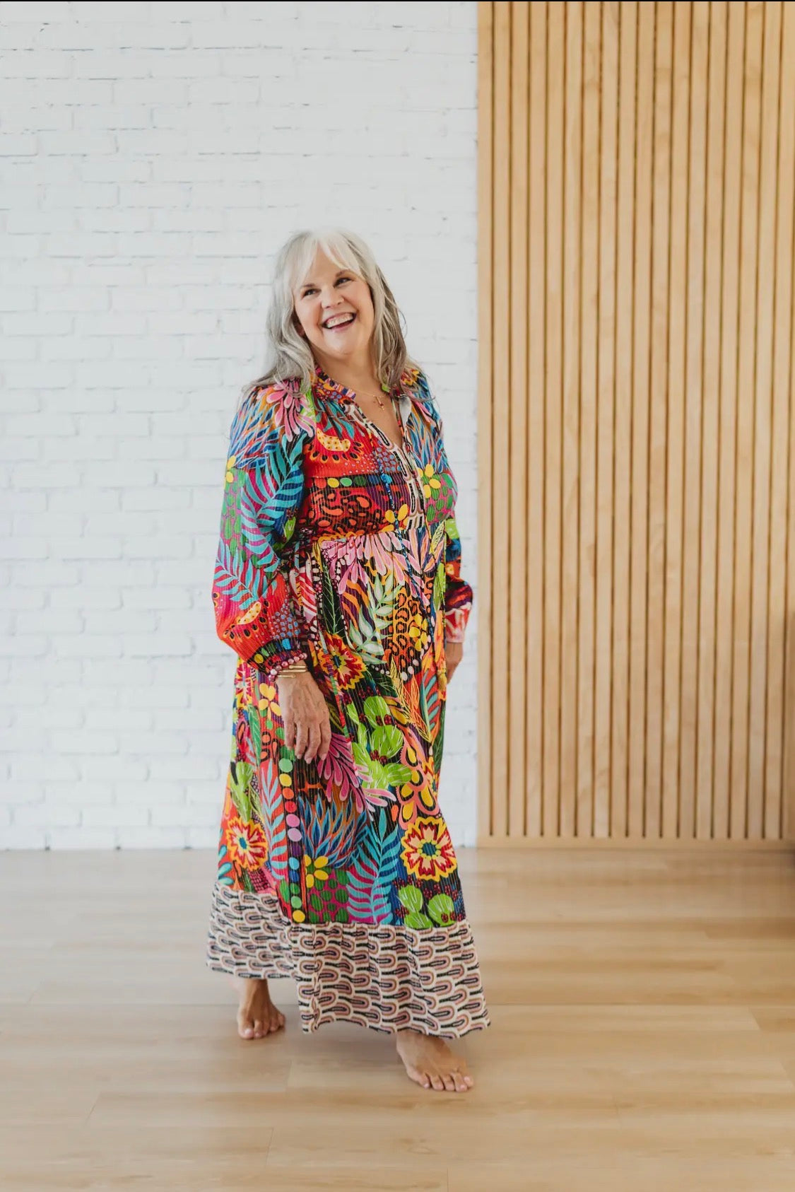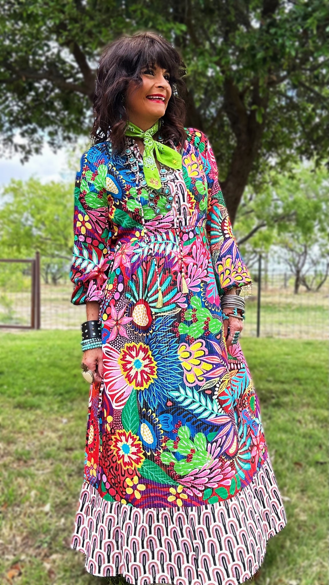 The Fiesta Floral Side-Tie Ruffle Dress offers a flattering fit to all shapes and sizes. Long sleeves with a ruffle trim neckline and embellished ties on front v neck placket. Additional ties at the waist make it easy to adjust this dress from a petite fit to a more generous fit.