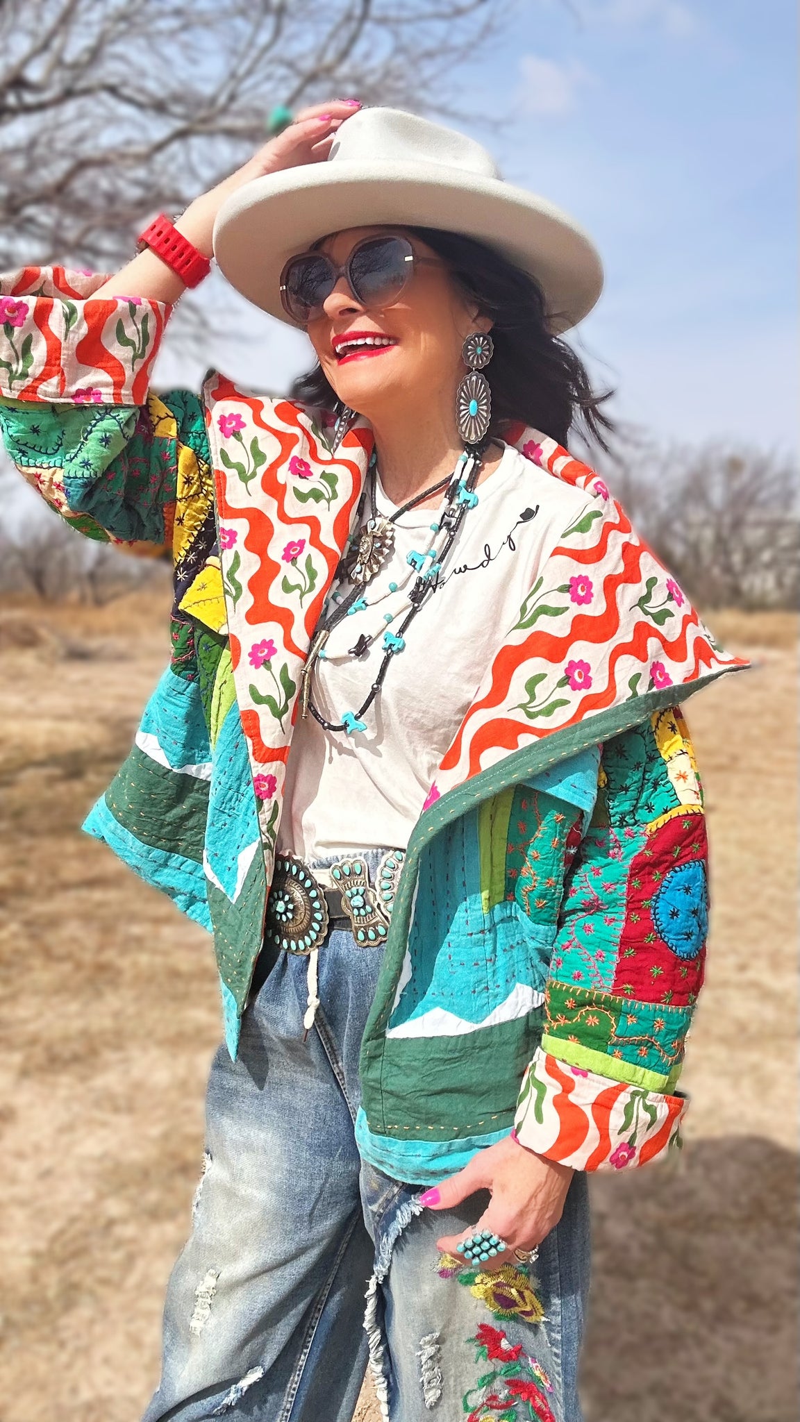The Heidi Jacket is a one-of-a-kind quilted statement piece featuring intricate patchwork embroidery and a vibrant floral lining. The flattering length, fly-away open collar, and two unique front pockets make it easy to wear and layer.