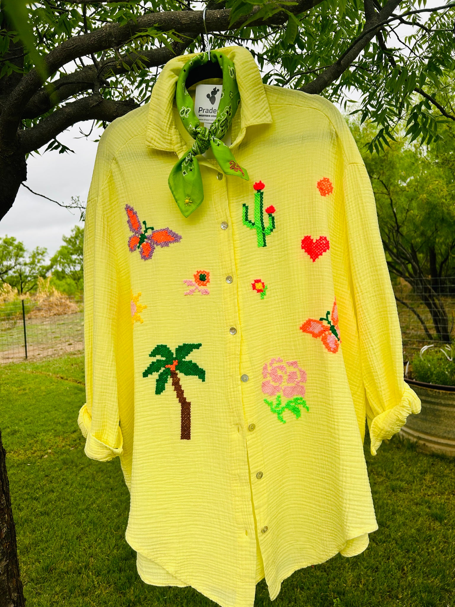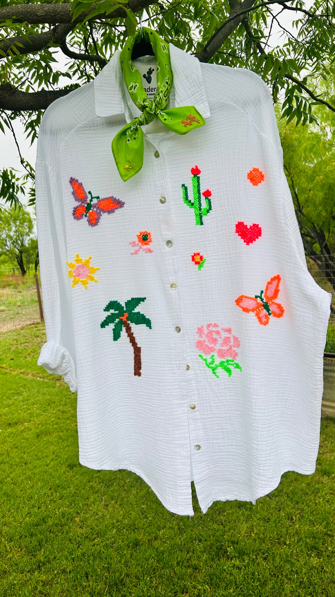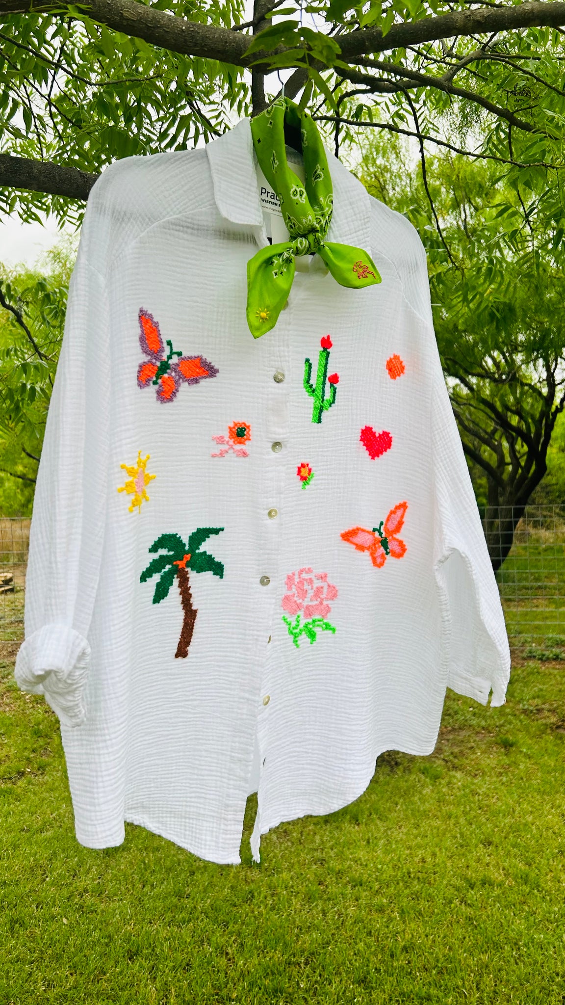 The shirt is detailed with colorful motifs including butterflies, cactus, palm tree, sun, flowers, and heart elements, adding a playful and summery feel.
