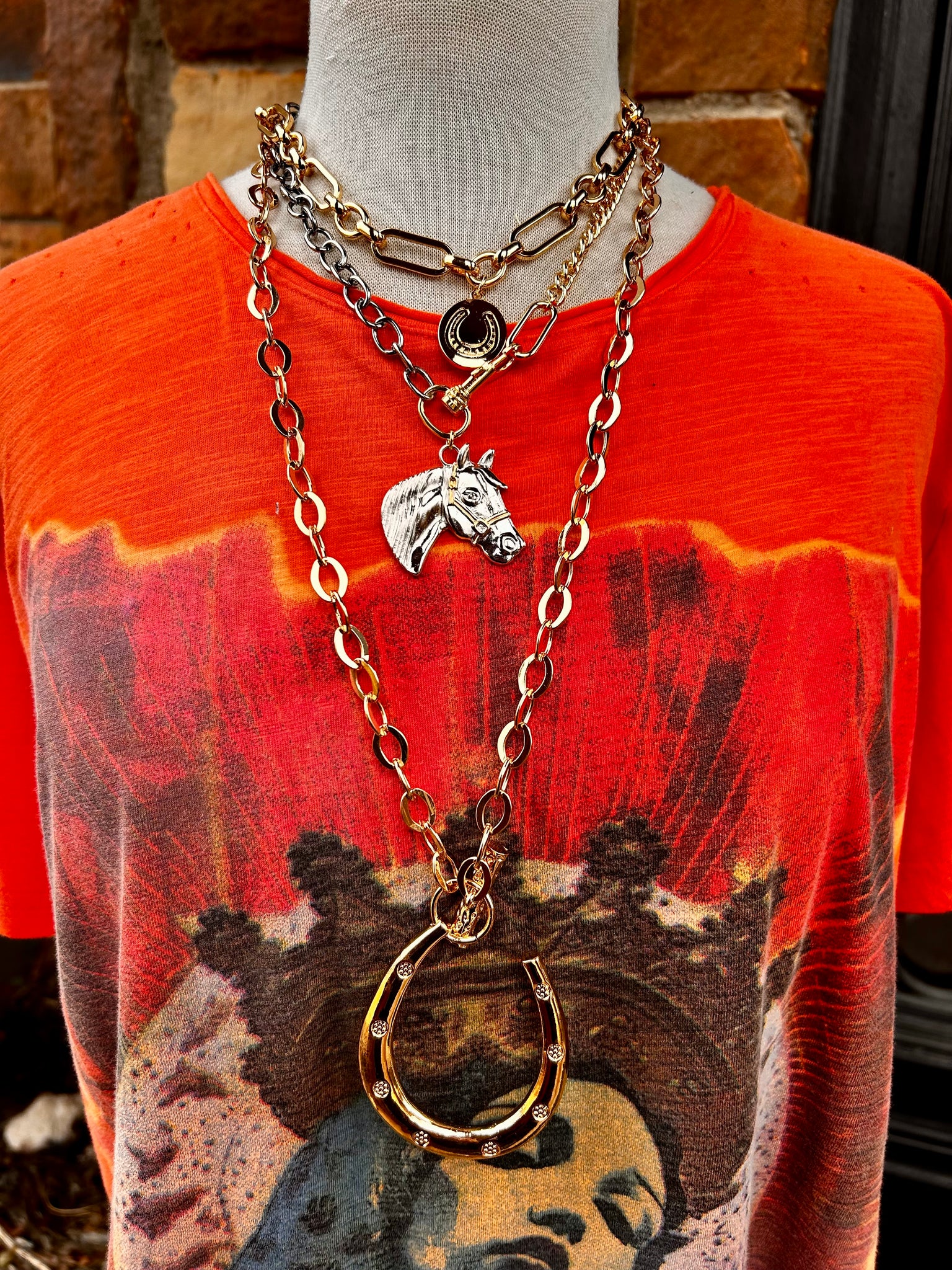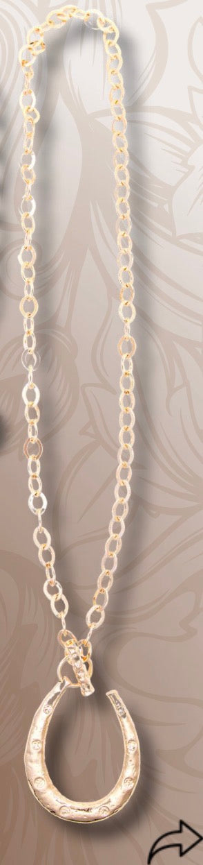Gold 34” chain necklace with toggle closure and large horseshoe
