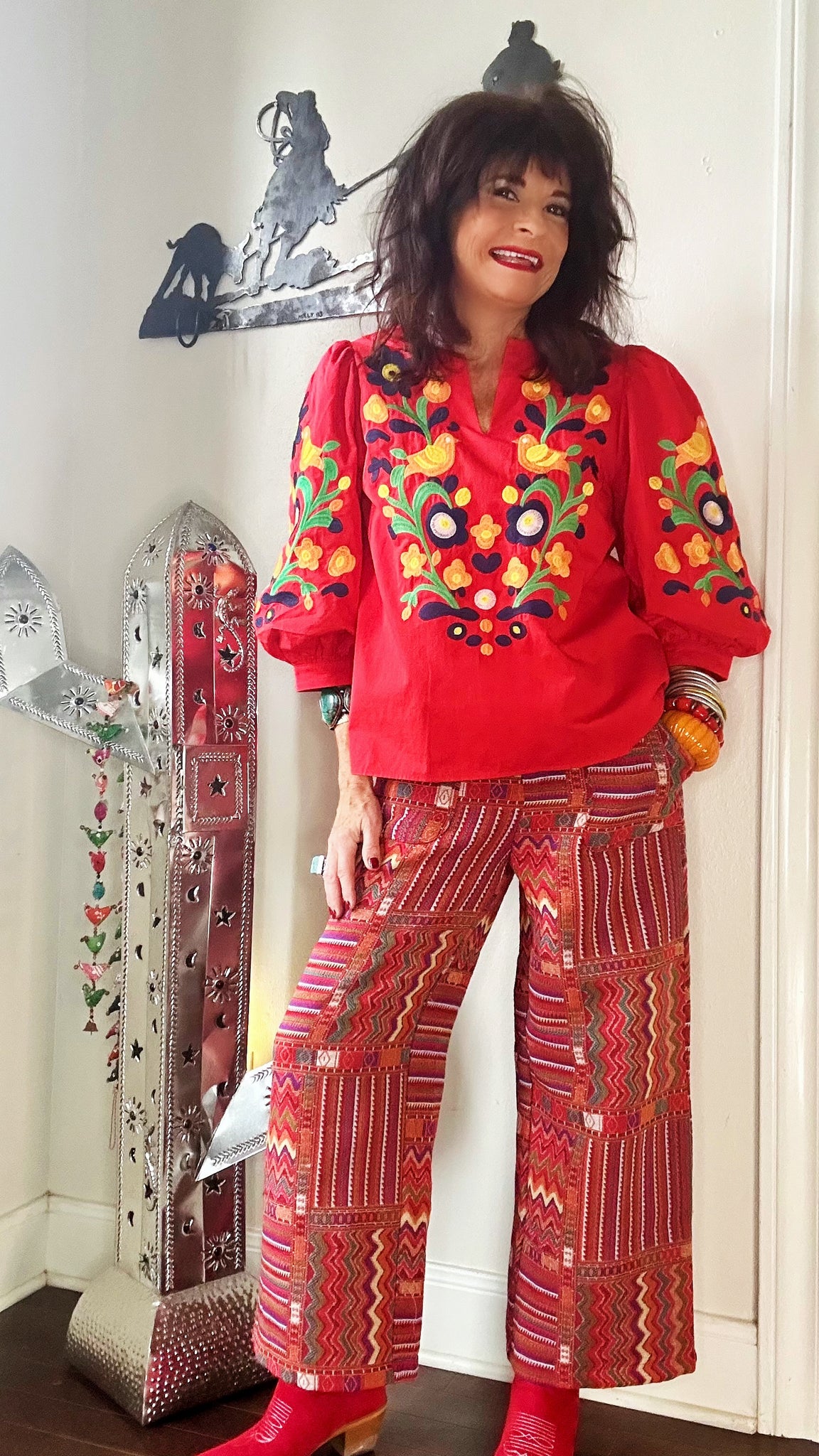These oversized, cropped pants combine comfort with a bold statement. Made from a thicker, tapestry-style woven fabric, these pants are ideal for warmer weather while offering a unique, eye-catching look. The back features an elastic waistband for a relaxed, flexible fit, complemented by a front wood-button and zipper closure for added style and functionality. The wide, roomy leg provides effortless movement, making these pants as comfortable as they are stylish.