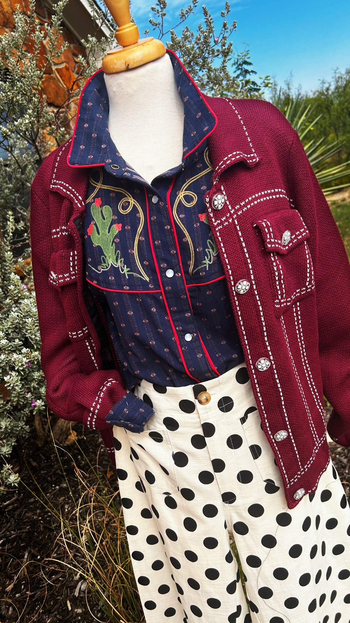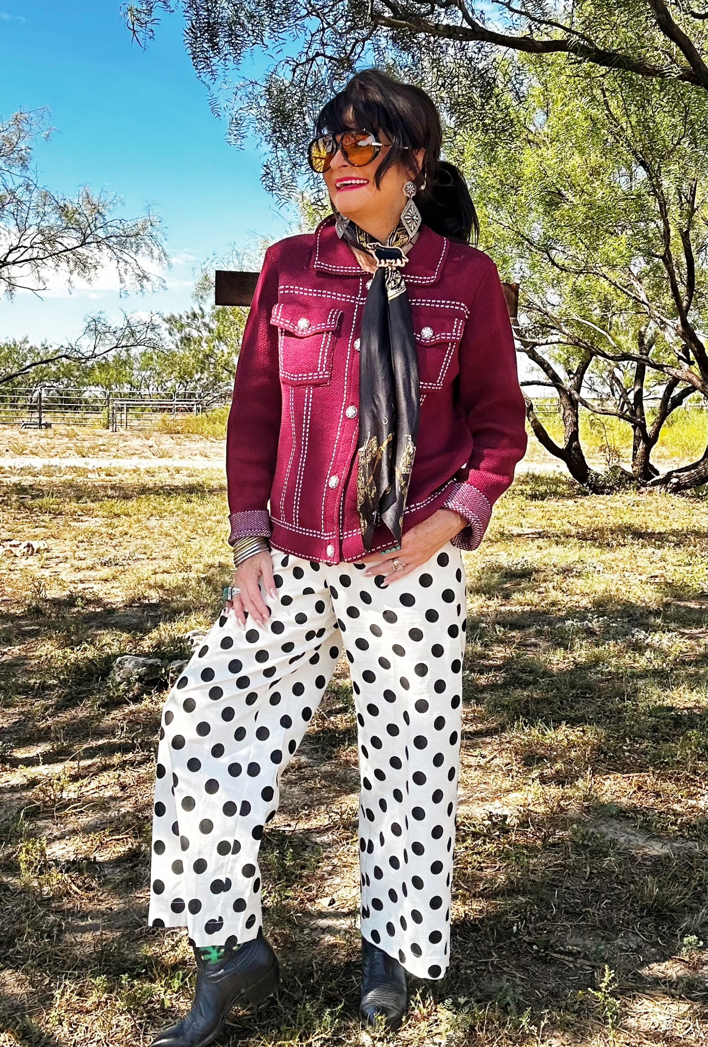 Polka dot print wide leg pants with hidden and zipper closure, back stretch band, side/back pockets.
