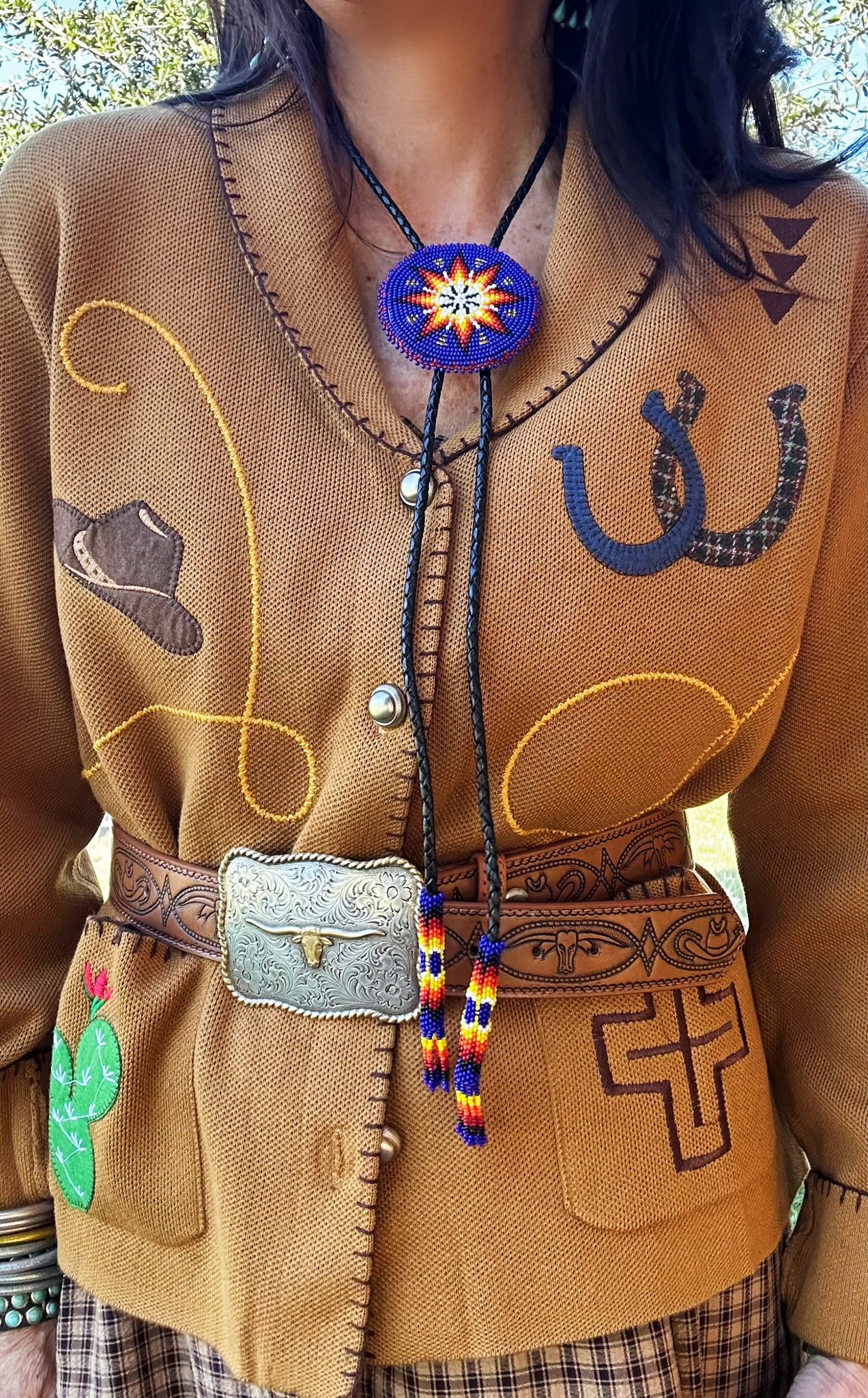 Details: long sleeve, western print, embroidery, V-neck, button down