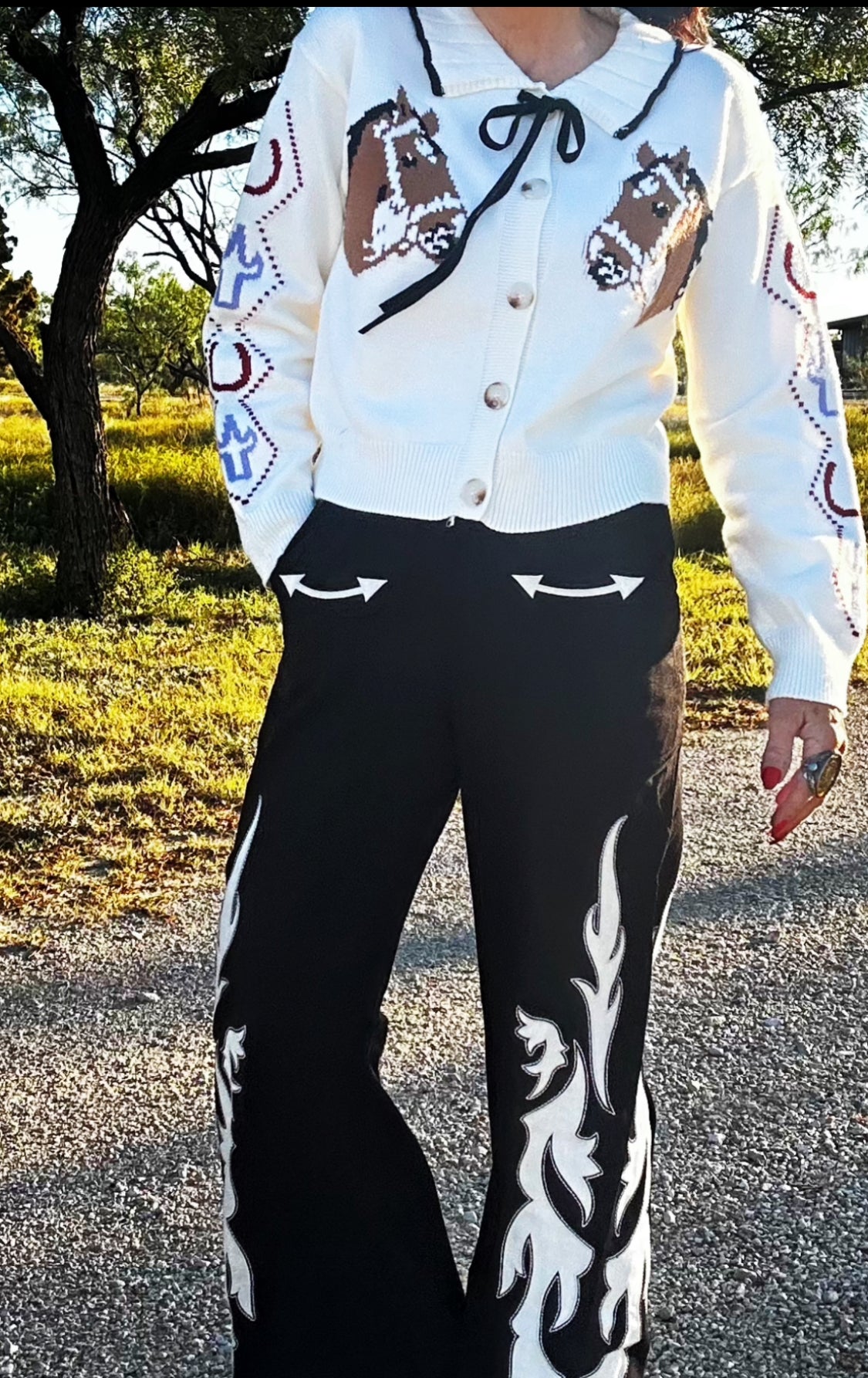 Whimsical button-up cardigan featuring horse face graphics, cowboy-inspired sleeve patterns, and a Peter Pan collar with velvet ribbon tie.