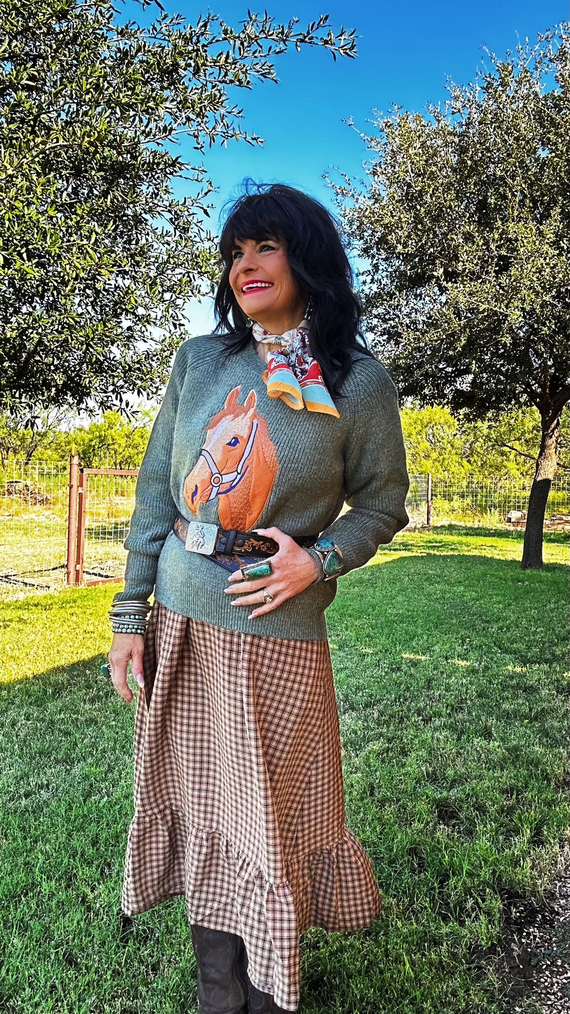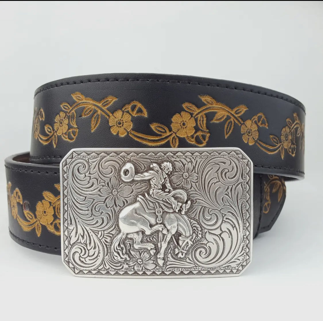 All leather tooled belt with bucking horse buckle