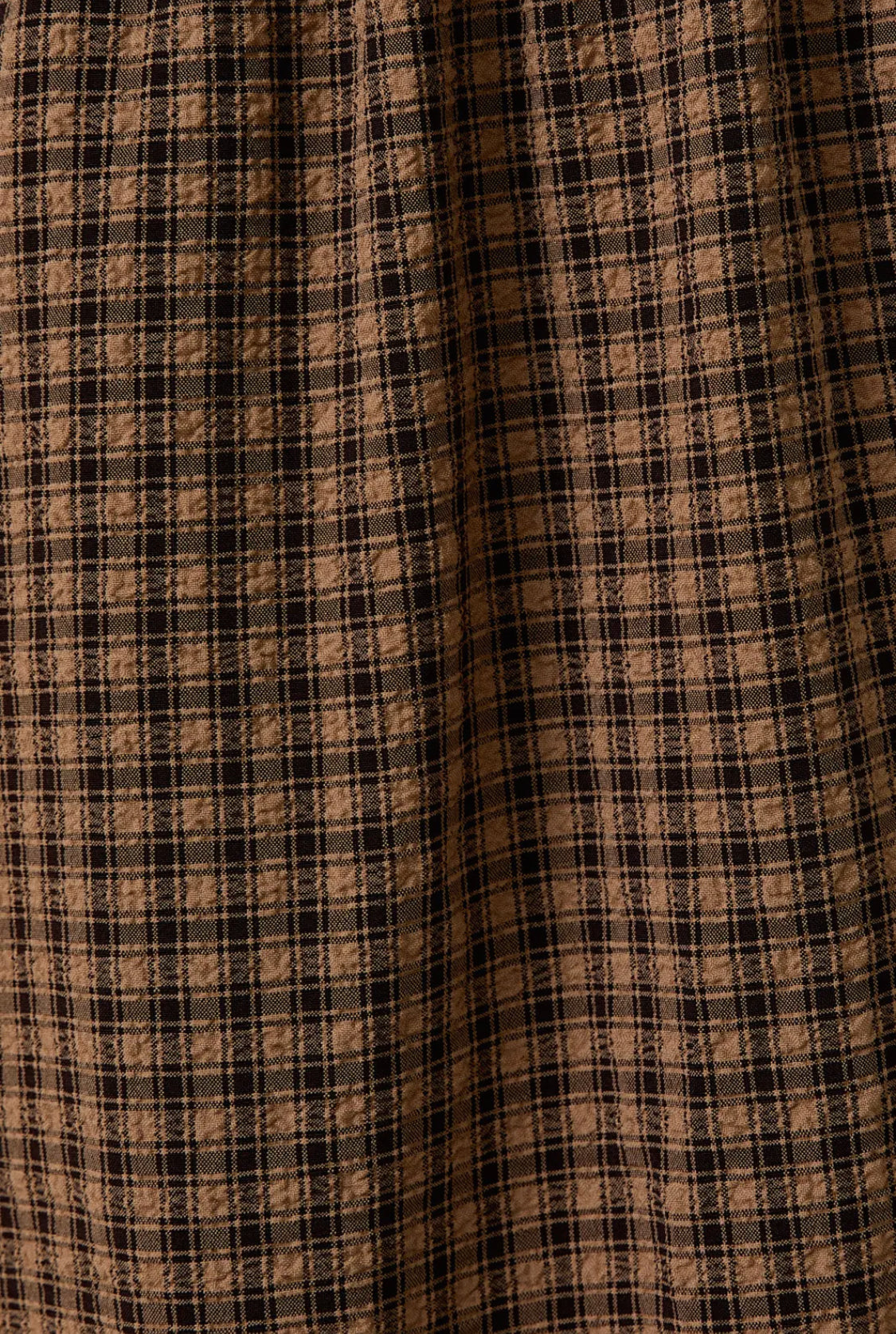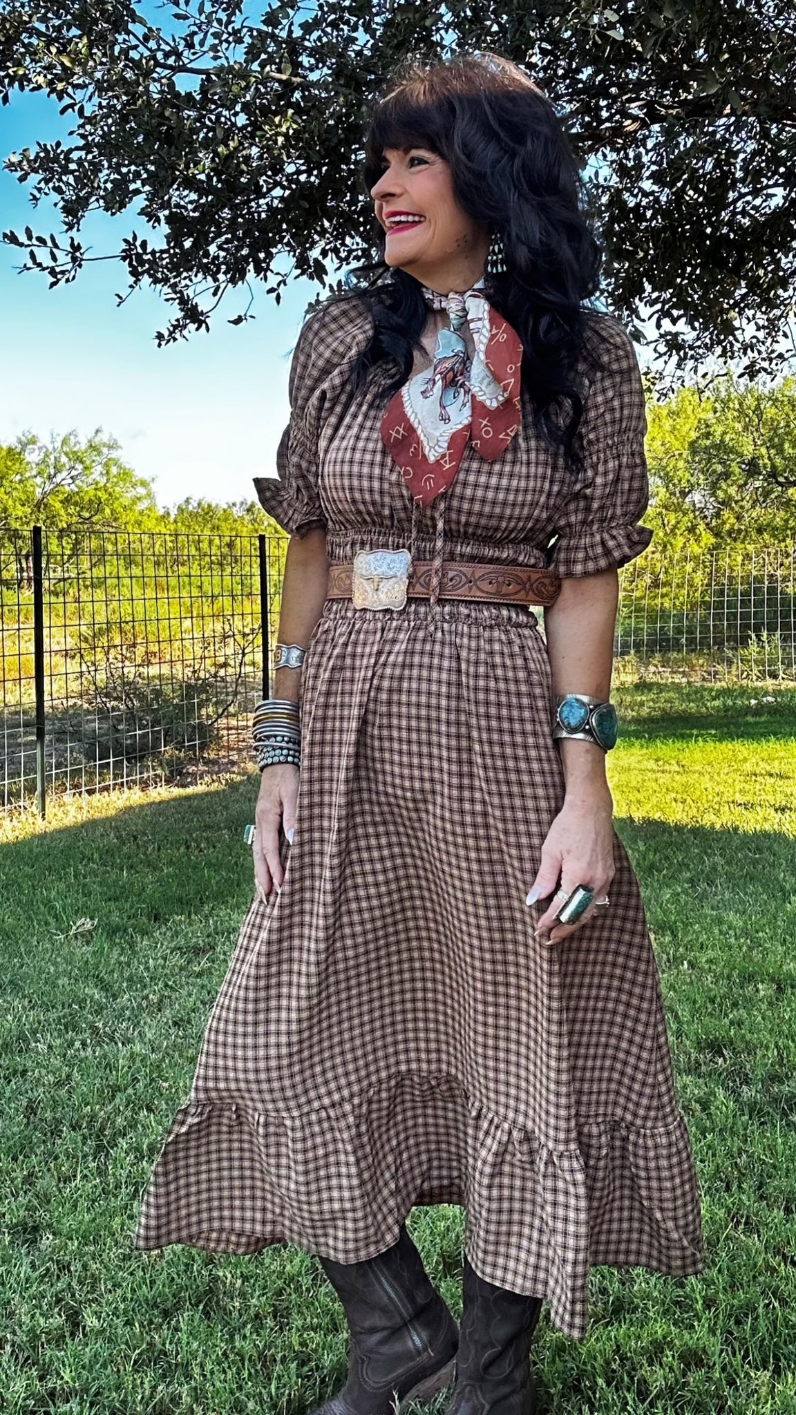 Taupe brown plaid smocked midi dress with scoop neck, puff sleeves.